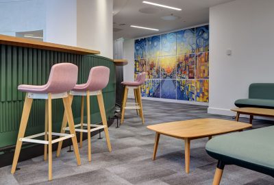 As their workspace was far away from the main building canteen, we fitted an office kitchen area with restaurant furniture including modular sofas, Ferro bistro tables, cafe chairs, soft armchairs and high bench tables with stools. This provided various comfortable spaces for staff to relax, chat or use as an informal meeting space.