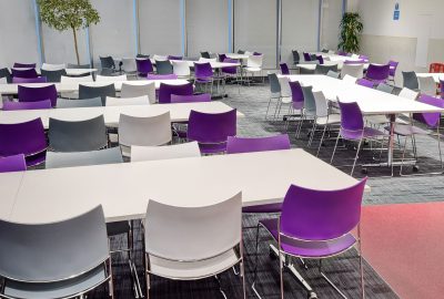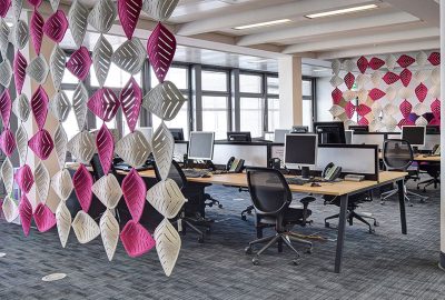 Throughout the office, you’ll find a vast collection of single working pods, semi-private booths and stools, and soft seating to host a range of meetings or to work privately. The two-toned semi-private meeting booths have built-in monitors and power and data for informal meetings and 1-2-1’s. The different designs all include built-in power and data, as well as a laptop holder. The poseur height tables and seating provide space for group work and team meetings and the ‘Shhh’ space is for those who want to work away from their desks. The acoustic panels dim any noises that can cause disturbances from the rest of the open-plan office.