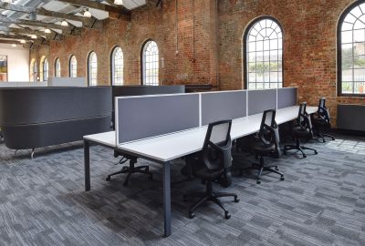 Within the staff offices, the buildings natural beams and supports were exposed to reflect the heritage, creating a unique workspace. To complement and fit around the structures, we installed our Flexiform single desk and side-to-side desks in a black frame, oak worktop and Dolly textured blue frameless desk screens. These desks were ideal for the space, as the varying configurations use the same components, which allows the client to reconfigure, extend and adapt the desk in the future. The work desks were completed with dual monitor arms and under desk personal storage, with Freestor Tambour storage cabinets nearby for general filing. All the office storage we supplied was lockable to help secure sensitive or personal information where necessary.