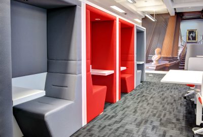 The flexible workspaces expand into a number of high-back meeting booths where teams can split from the main floor plate to meet and collaborate, all equipped with power and data modules so that users can “plug and play”. The mock-up will be used by staff for a number of months and the office furniture selected will become the template for the Town Hall and Civic Centre fit-out.