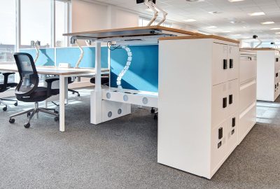 At the Newburn Warehouse, we have installed NHS BSA’s standard range of office furniture to keep visual and operational consistency across their various sites. This “standard” range includes our Pico back-to-back bench desking with Jot-Up height adjustable desks on the end, specified with double monitor arms, privacy screens and on-desk electrics for a full IT set-up. The banks of desk have bespoke Freestor Accent lockers on the end for personal storage and feature keypad locks, bottom drawers and label holders.