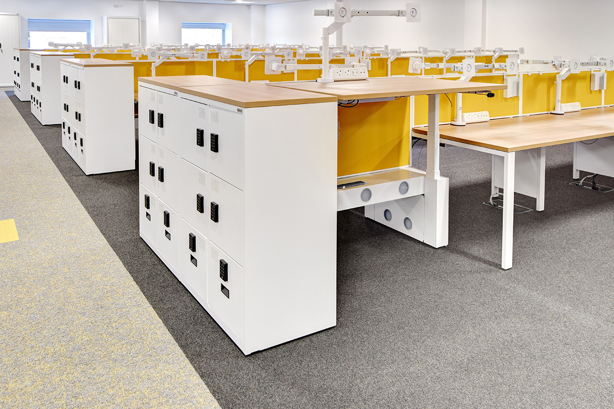 At the Newburn Warehouse, we have installed NHS BSA’s standard range of office furniture to keep visual and operational consistency across their various sites. This “standard” range includes our Pico back-to-back bench desking with Jot-Up height adjustable desks on the end, specified with double monitor arms, privacy screens and on-desk electrics for a full IT set-up. The banks of desk have bespoke Freestor Accent lockers on the end for personal storage and feature keypad locks, bottom drawers and label holders.