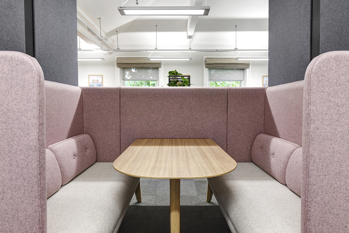 To support privacy and focused work, dedicated quiet spaces included single pods for video calls and a mixture of Orangebox Camper & Dens and Air collaborative pods. These meeting pods help define space, absorb noise, and offer comfortable, distraction-free environments for users both inside and nearby. All zones were kitted out with appropriate electrical charging points to support phone and laptop charging.