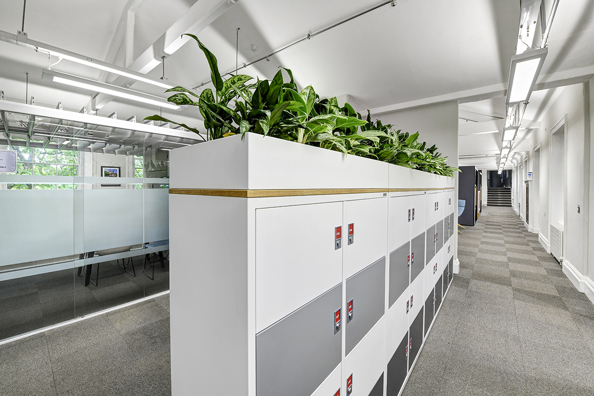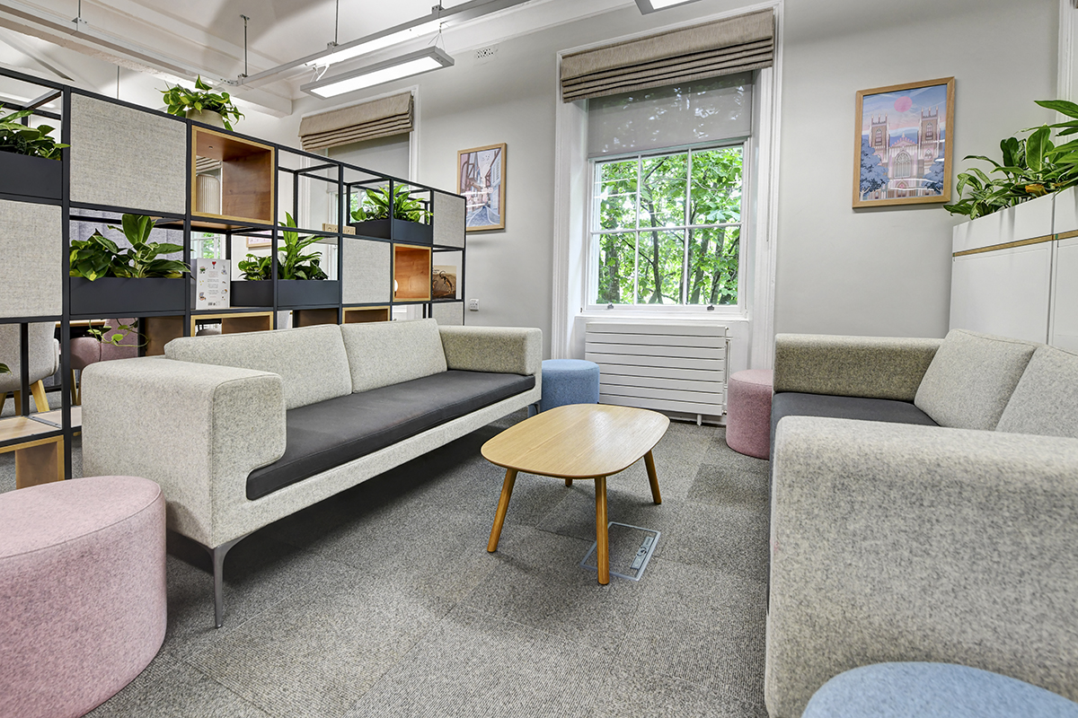 Distinct pockets of workspace were created using FlexiGrid office shelving, freestanding acoustic baffles with adjustable upholstered uprights, and Freestor tambour storage with planters, helping to define zones, reduce noise, and add privacy. Each zone offered a unique tone and purpose: Orangebox Vale upholstered sofas paired with Pledge Box pouffes introduced soft, informal seating ideal for relaxed collaboration. The Channel work table, fitted with adjustable task lighting and paired with Miss Collaborative chairs, created a dynamic touchdown area for both focused work and teamwork. Another zone featured the Larke poseur-height work table with an overhead gantry and planters, accompanied by Miss wooden stools, offering a flexible team workspace. Lastly, Orangebox Coze meeting booths provided a soft, upholstered setting for informal meetings.
