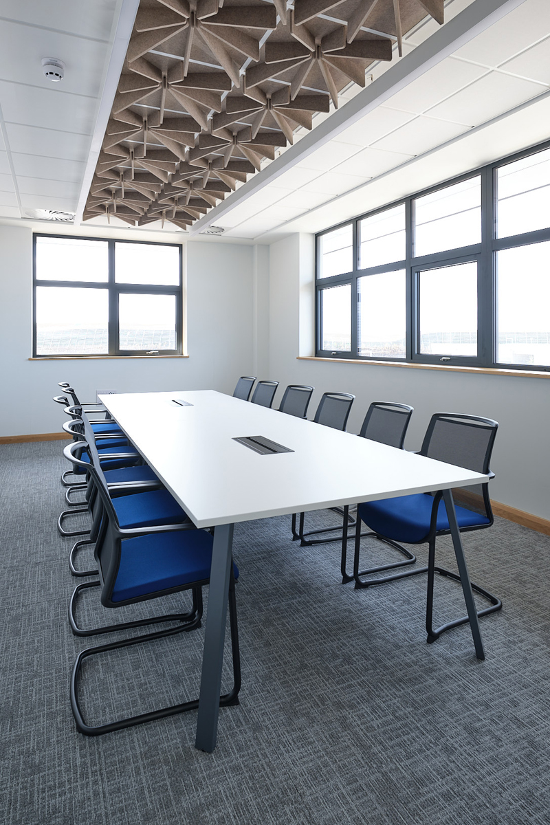 Creating a welcoming and comfortable workspace to support employee wellbeing was just as important to Yusen Logistics as sourcing sustainable furniture. This goal was achieved through thoughtful design, focusing on proven office design principles: comfort, acoustics, biophilia, and breakout spaces. Soft furnishings were prioritised throughout the installation, including modular office sofas, café booths, and upholstered Miss chairs and stools to maximise comfort. Ventilo task chairs were chosen to promote movement throughout the day and allow users to adjust the chair to their individual needs. For meeting rooms, Cyla mesh-back cantilever chairs were selected to provide breathable support during longer sessions. To improve acoustics and minimise distractions, wall-mounted and suspended acoustic panels and baffles were installed across the workspace.