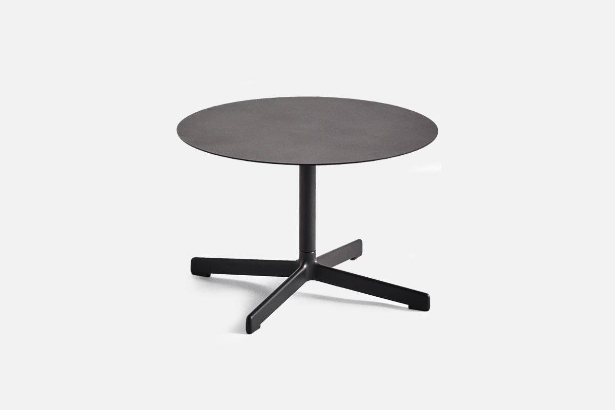 In-Out Table is a bold, modular table range featuring sculptural steel legs and soft detailing, with a distinctive radiused underside edge. Available in round, square, and long formats, it comes in black or white, with custom colours and power options.