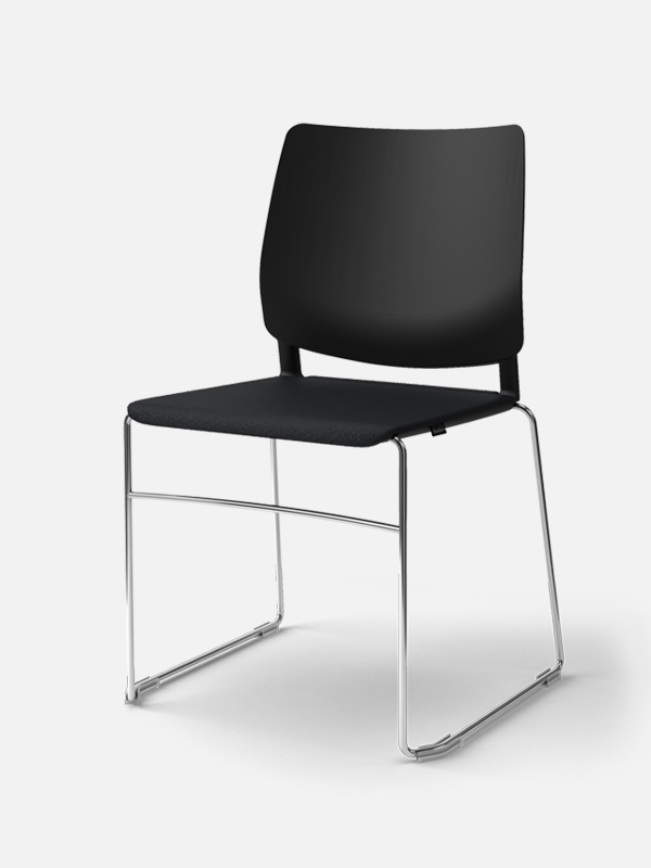 Melita 100% recycled and recyclable chair is available with a painted black skid base and no arms. For more information, visit Melita stacking chair, or Melita stool.