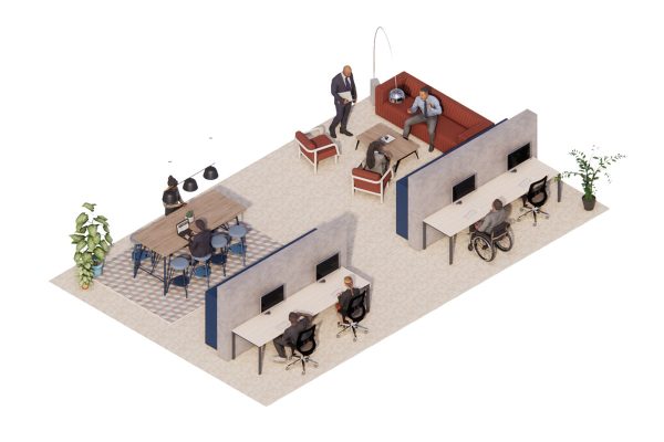 Pico Desks, Additions 2 Tables, Fauna Planters, Tambour Storage & Office Pod Mini Workspace Configuration