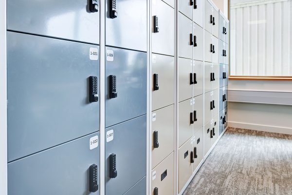 Bespoke Freestor Accent Office Lockers with Vinyl Numbers & Cladding [Photo: David Cadzow]